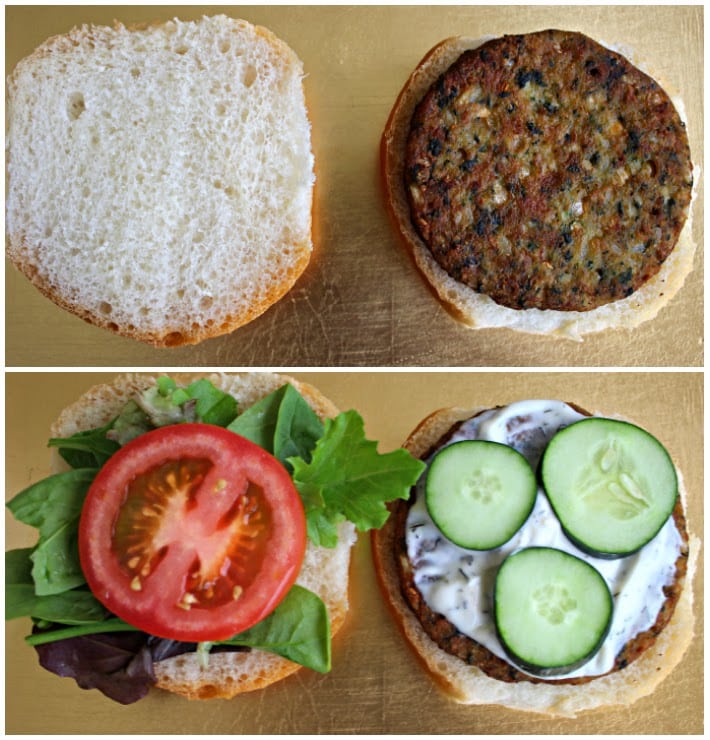 To create my dream burger, I added spring mix lettuce, a juicy sliced tomato, a handful of cucumber slices, and a thick coating of cucumber yogurt dip with feta that I bought at the grocery store. The burger took about five minutes total to make, and it will be on permanent rotation in my weekly meal schedule!