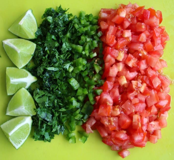 To make the pico de gallo, chop 3-4 medium tomatoes into small cubes. Then finely dice your desired amount of jalapenos (I use about 1.5 jalapenos per 3-4 tomatoes) along with a large handful of cilantros. Add the chopped vegetables and herbs to a large bowl and squeeze the juice of 1-2 limes over the mixture. Add salt to taste, and let the mixture sit for about 30 minutes to allow the flavors to combine!